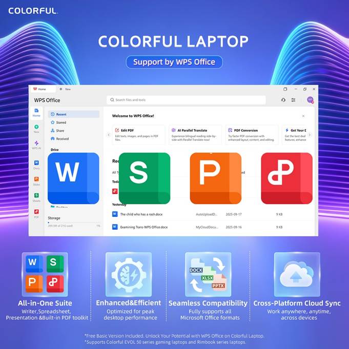 In addition to gaming and creative performance, the EVOL P15 series is equipped for everyday productivity and academic use with WPS Office pre-installed on Windows 11 Home. The WPS Office suite provides full compatibility with common Word, Excel, and PowerPoint file formats, allowing users to create, edit, and share documents seamlessly across platforms.