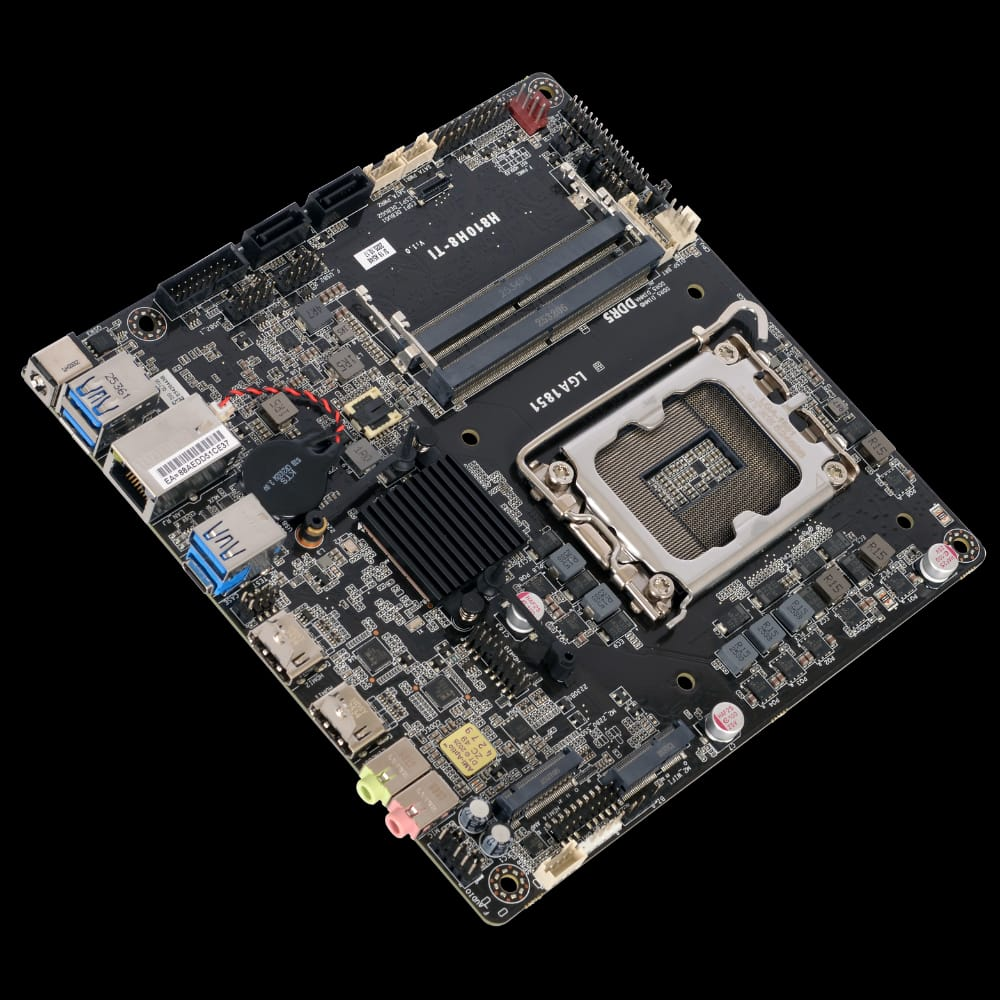 ECS will also showcase the H810H8-TI Thin Mini-ITX motherboard, based on the Intel® H810 chipset and supporting Intel® Core™ Ultra processors for the LGA 1851 socket (up to 65W TDP). The board supports dual-channel DDR5 6400MHz memory up to 96GB and integrates PCIe Gen5 x4 M.2 2280 for high-speed NVMe SSDs, along with M.2 2230 Key E for wireless expansion. For system integration, H810H8-TI provides two HDMI outputs, 2.5GbE LAN, and two SATA 6Gb/s ports, together with a comprehensive set of onboard headers including COM, LVDS, SATA power, front panel, and audio. Measuring 170 x 170 mm and supporting Windows 11 and Linux, the board is designed for embedded systems, digital signage players, and compact industrial PC platforms.