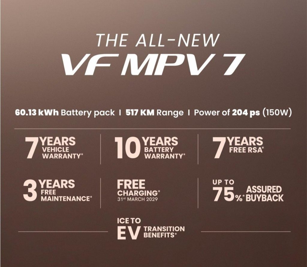 In addition, the VF MPV 7 comes with a comprehensive ownership package, including 3-year free maintenance, a 10-year battery warranty, a 7-year vehicle warranty, a 5-year suspension warranty, a 7-year paint warranty, and 7 years of roadside assistance, delivering a best-in-segment assurance package for customers.